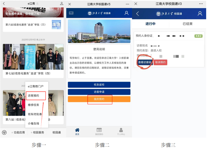 考生采用“访客预约”入校,考生请按照以下步骤进行操作: