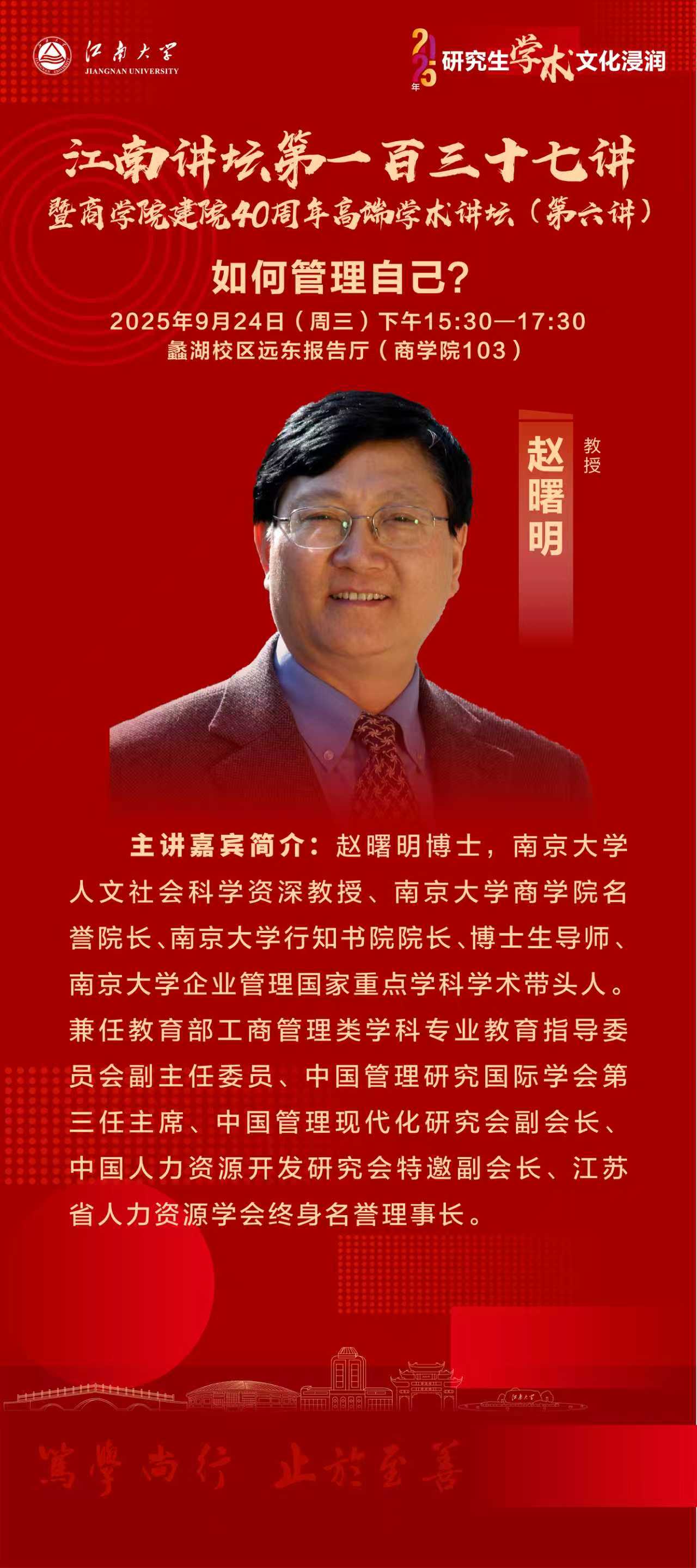 赵曙明博士,南京大学人文社会科学资深教授、南京大学awc777万象城娱乐官网名誉院长、南京大学行知书院院长、博士生导师、南京大学企业管理国家重点学科学术带头人。兼任教育部工商管理类学科专业教育指导委员会副主任委员、中国管理研究国际学会第三任主席、中国管理现代化研究会副会长、中国人力资源开发研究会特邀副会长、江苏省人力资源学会终身名誉理事长。