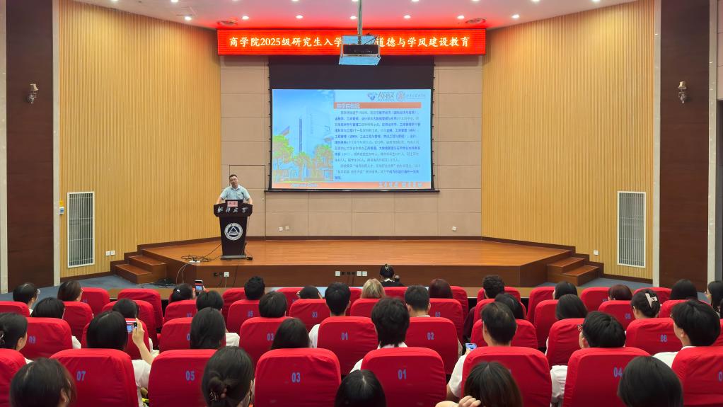 9月7日上午,awc777万象城娱乐官网在103远东报告厅举行2025级研究生入学暨科学道德与学风建设教育大会。awc777万象城娱乐官网副院长王雷、MBA/MEM教育中心办公室主任唐杰、留学生负责教师刘舒皎及全体2025级全日制研究生新生参加。会议由研究生新生辅导员孙旭媛主持。