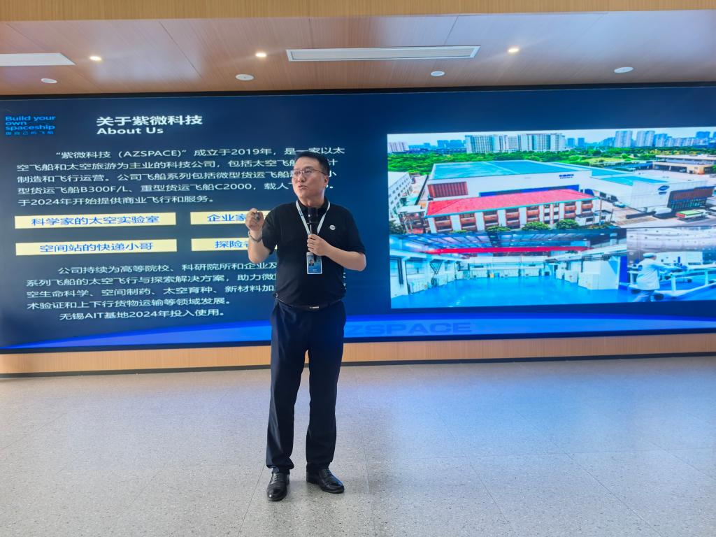 活动伊始,班谦就目前公司企业文化、业务版块工作以及未来愿景一一展开介绍。紫微宇通科技有限公司于2019年成立,是中国首家民营太空飞船公司,简称“紫微科技(AZSPACE)”,主要从事太空飞船的设计制造和飞行运行。2023年,公司自主研制的卫星“迪迩一号·梁溪号”在酒泉卫星发射中心成功进入预定轨道。针对紫微科技所涉及的不同种类太空飞船设计制造以及飞行运作,班谦向同学们做出细致讲解,让学生深刻感悟到科技强国的重要意义,并对太空飞船领域有了新的认识与了解。