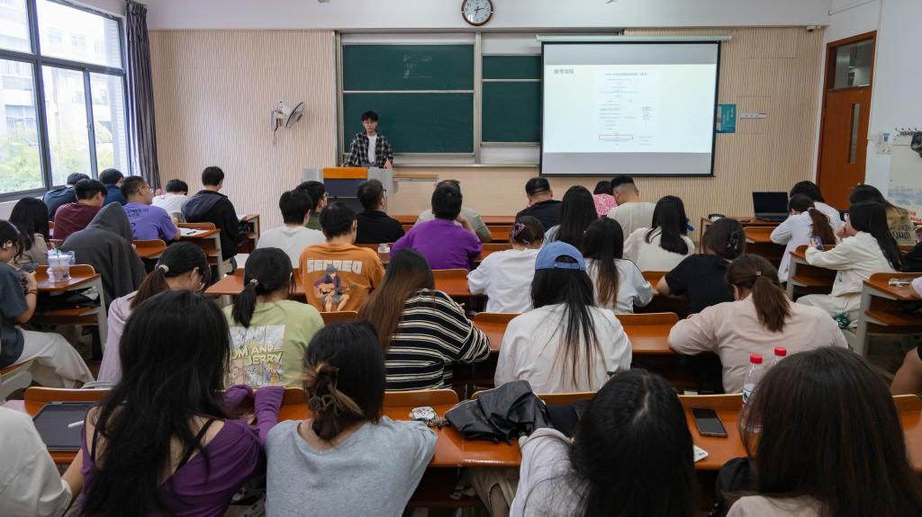雷淳智为在场同学系统分享了考研院校选择、报考流程与备考策略。他结合个人备考经历,从院校选择动机、报考流程细节、管综复习规划等多个维度展开讲解,并特别强调真题训练与心态调整的重要性。他鼓励同学们要坚持行动、合理择校、保持锻炼,以踏实心态沉着应考。