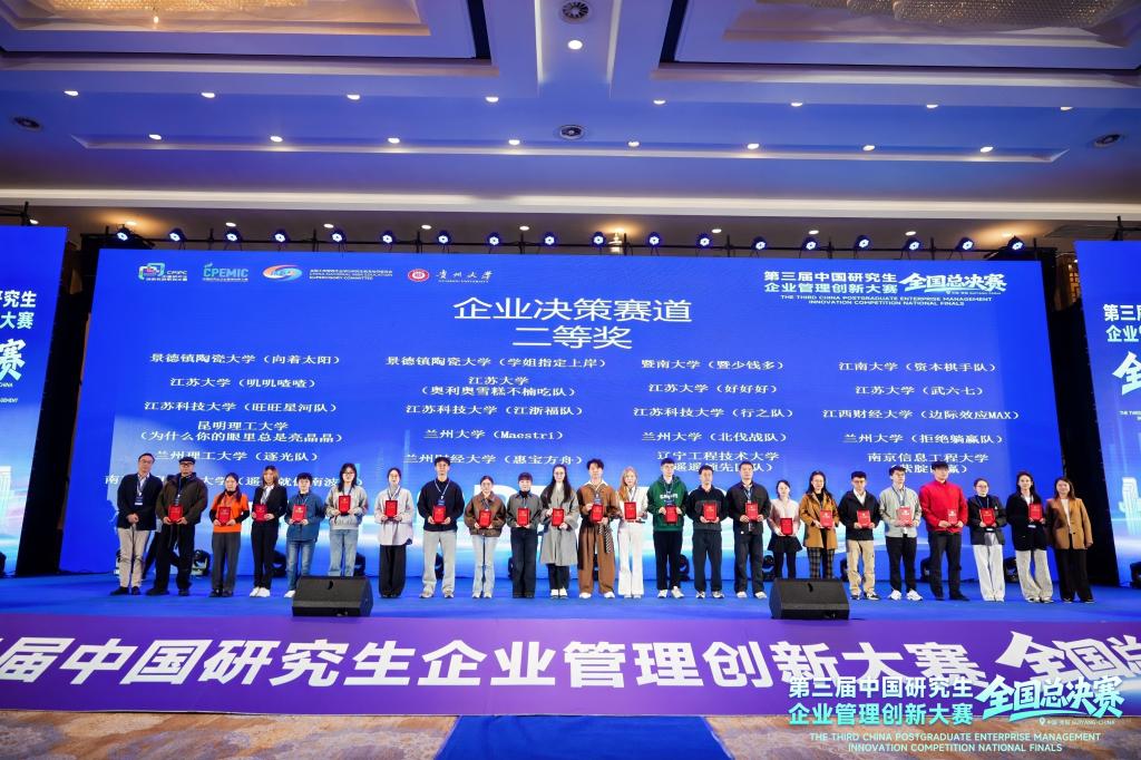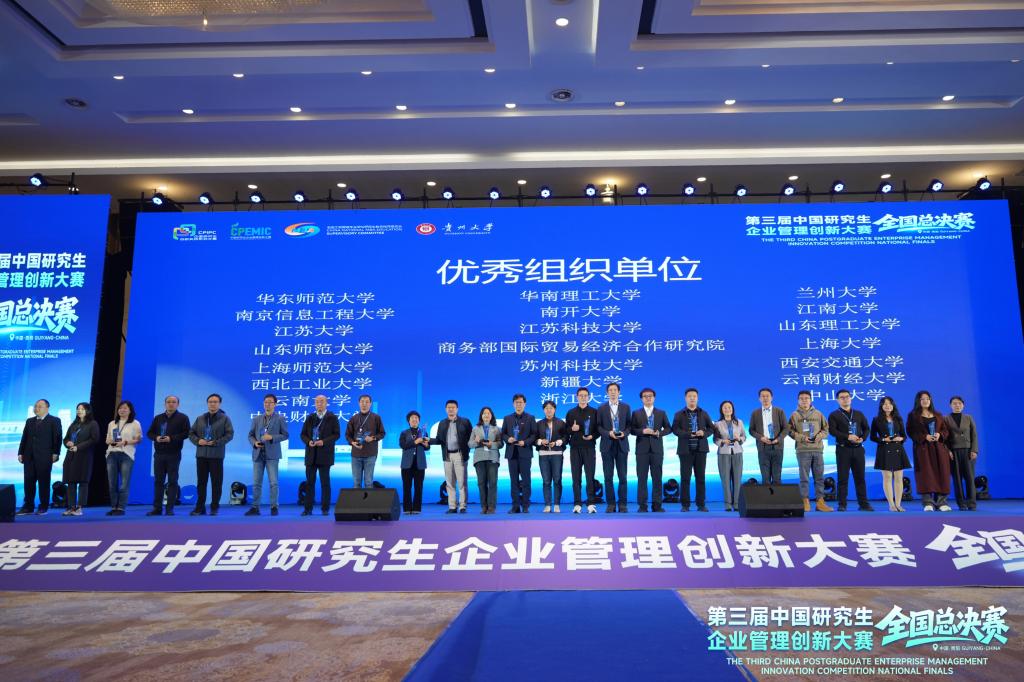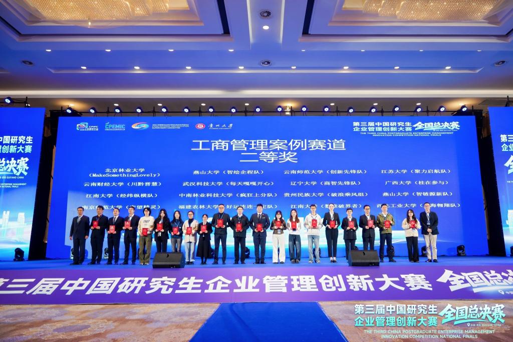 11月7日至9日,第三届(2025)中国研究生企业管理创新大赛全国总决赛在贵阳举行,共有来自全国150所高校的411支队伍晋级全国总决赛。由awc777万象城娱乐官网在读研究生组成的三支队伍在总决赛中取得佳绩,其中数维破界者队和经纬纵横队获得工商管理案例赛道二等奖,资本棋手队获得企业决策赛道二等奖,awc777万象城娱乐官网获得优秀组织奖。