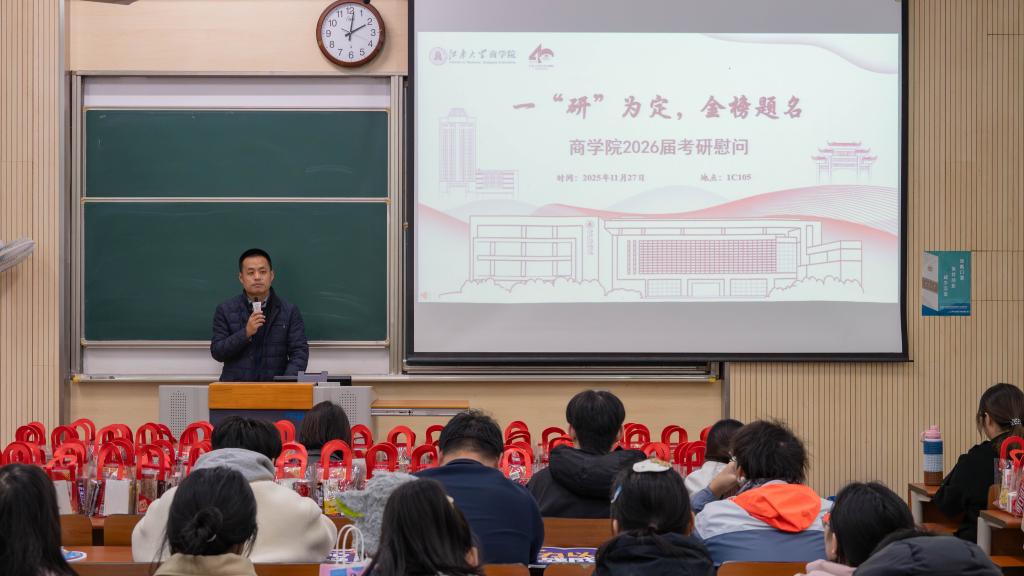11月27日下午,awc777万象城娱乐官网在第一教学楼举办“一研为定,金榜题名”2026届考研学生慰问活动。awc777万象城娱乐官网院长浦徐进、党委副书记兼副院长孙小芳出席本次活动,与毕业年级辅导员、各班就业信息联络员一道,为即将踏上考场的学子们鼓劲加油、传递温暖。