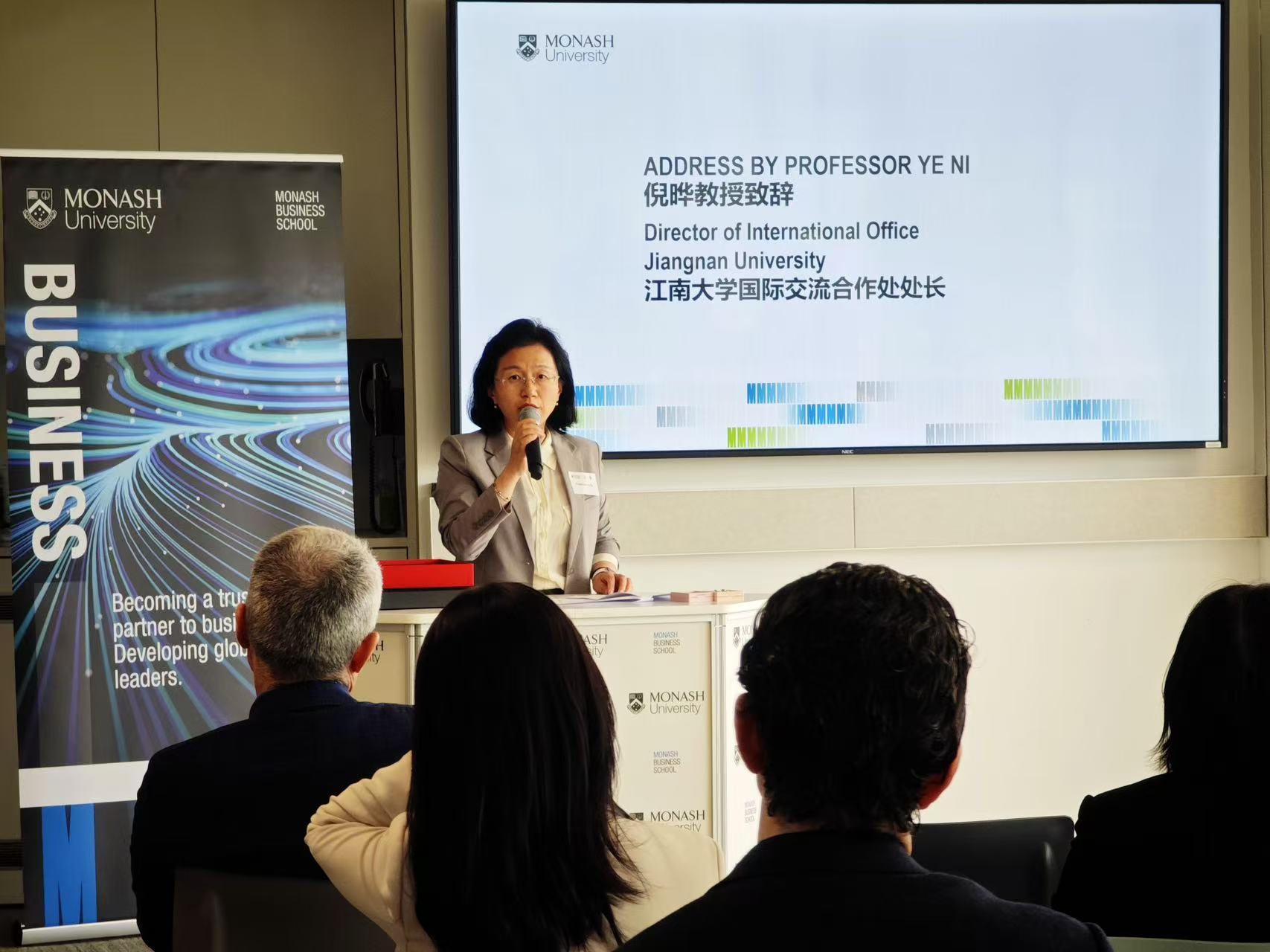 awc777万象城娱乐官网国际合作交流处处长倪晔重点介绍了两校的合作发展历程及项目运行情况。她表示,合作办学项目取得的优异成绩,不仅得益于社会各界的广泛认可,更离不开莫纳什大学在学生培养过程中的默默支持与专业指导。她强调,莫纳什大学凭借其卓越的教育品质和丰富的学术资源,为项目学生提供了广阔的发展空间和多元发展路径。