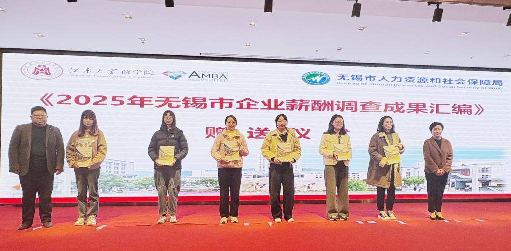 在2025年无锡市企业薪酬调查成果汇编赠送仪式上,张映雪、刘长青为企业代表赠送本次成果汇编并合影留念。